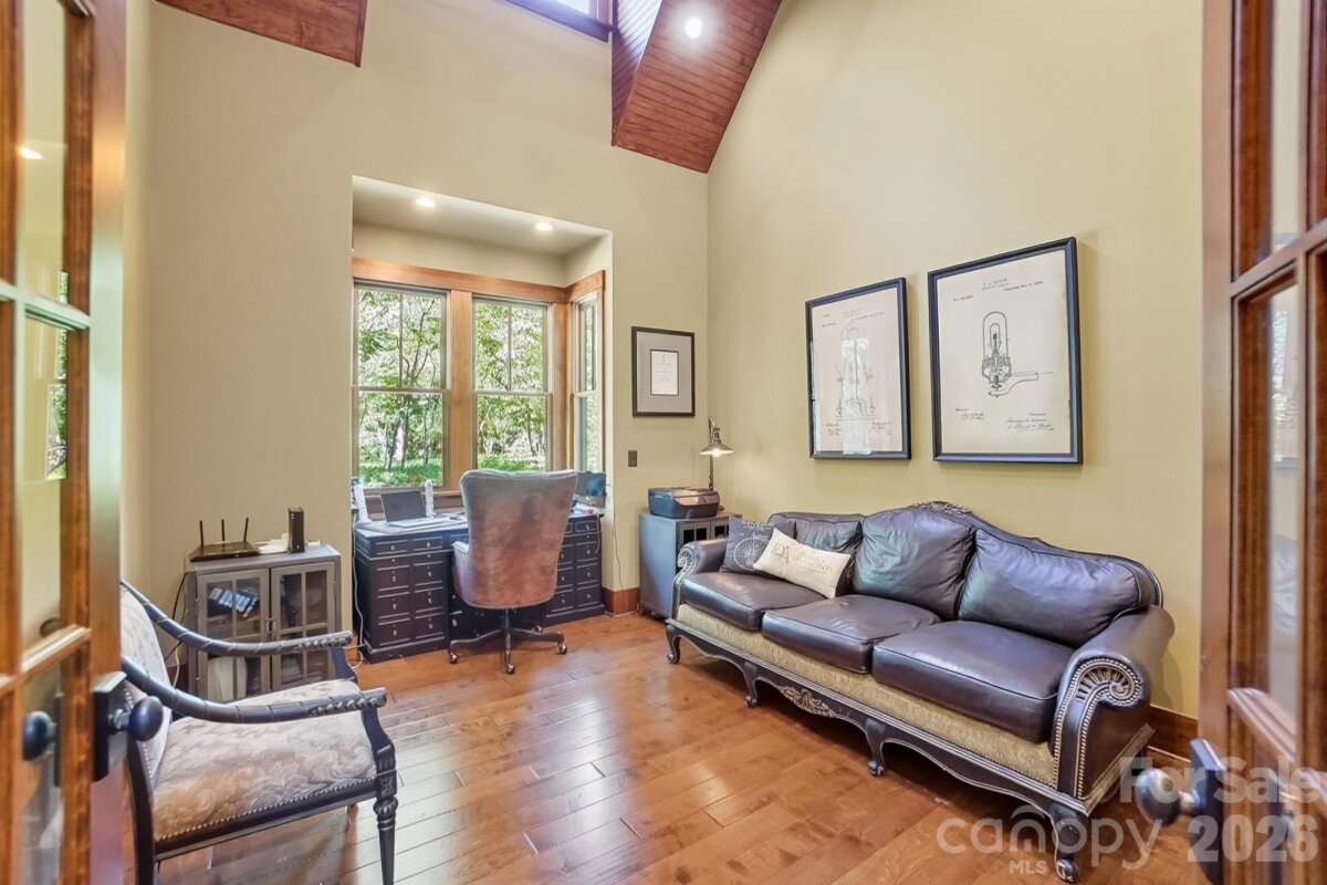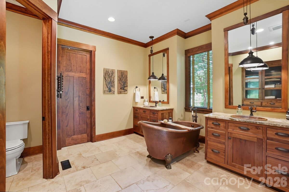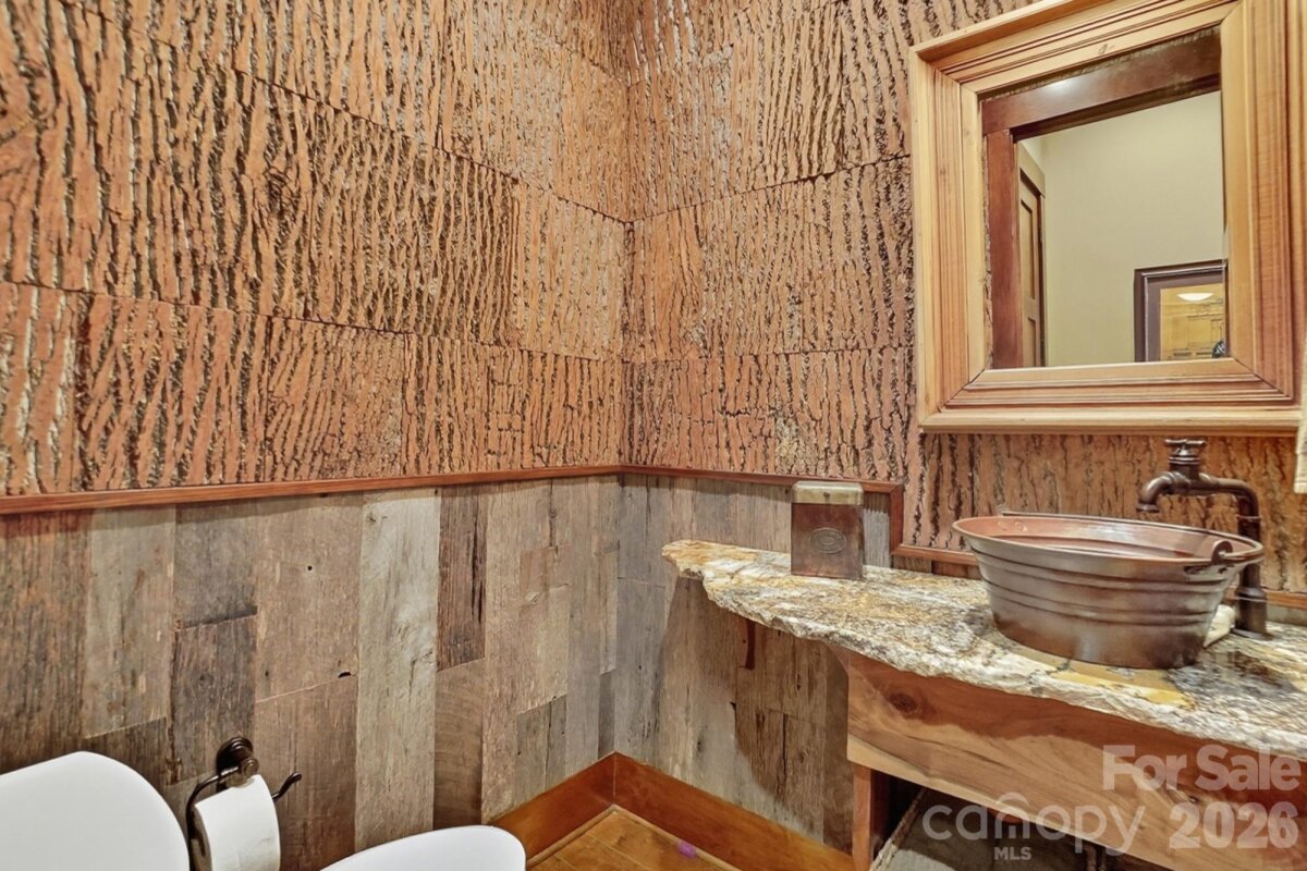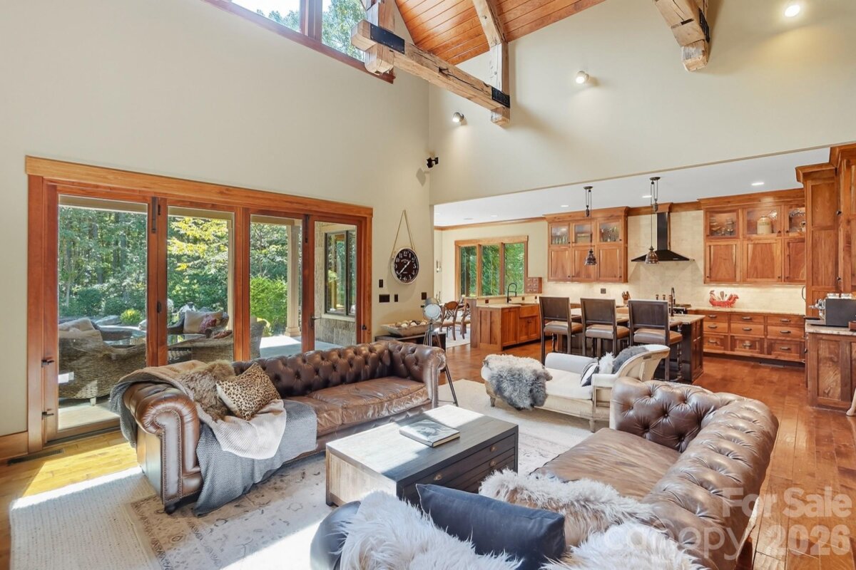 This custom rustic beauty with one-of a kind appointments has 100% privacy!! Located on 2.27 acres in the exclusive "The Sanctuary" near Lake Wylie. Everything customized including the Poplar Bark Siding, Ash handscraped floor, knotty alder front & side doors & more! Upstairs, the additional 1,030 sf of plumbed & wired unfinished attic storage, could easily be finished adding 2 more bedrooms w/full baths. Instant equity!! Beautiful architectural details include the hand hewn wood beams & ballusters with iron straps, barnwood coffered ceiling, solid brass door knobs, extensive moldings & high ceilings. Dramatic 2 story great room with stacked stone fireplace and reclaimed mountain wood mantle, opens up to the back porch with bifold glass & mahogany doors. Home has a sound system with Polk speakers throughout. Primary suite on the main with its own private back deck made of Brazilian Ipe wood. Primary bath has a gorgeous copper clawfoot tub and sinks, in addition to the travertine shower with rainshower head and 2 huge glass windows. Kitchen has an Aga Legacy gas stove w/electric oven from UK, 2 Bosch dishwashers, Thermador refrigerator and solid walnut cabinets. Vaulted 2 story office on the main with french doors. Inviting covered back porch with hand-chiseled flagstone. Spacious porch is accented by a stacked stone wood burning fireplace with gas starter. Oversized 3 car garage. Property has an inground salt water/ozone gunite pool with 2 waterfalls and a redwood greenhouse with bark siding and stacked stone exterior and teak flooring inside. On the property, there is a fenced kids play area or garden separate from the pool. Fence is a Bunze commercial grade fence. Superior materials and workmanship!! This home is absolutely stunning!!