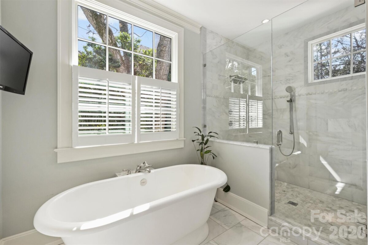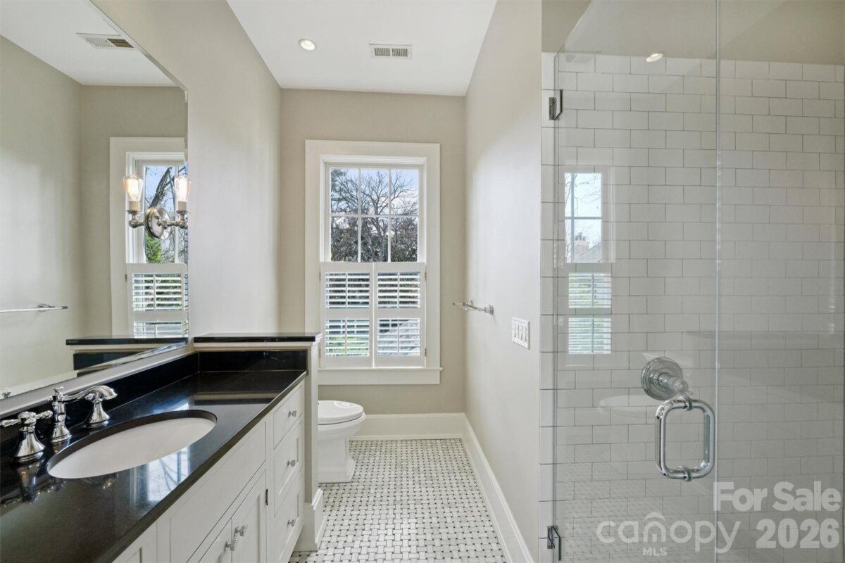 Introducing 1136 Queens Road — an exceptional Myers Park residence on Queens Road blending timeless architecture with beautiful and thoughtful updates. A grand foyer, wide hallways, soaring 11-foot ceilings, and an impressive staircase set the tone for this special home. The main level features a light-filled sunroom, dedicated study, formal living and dining rooms, and an updated kitchen open to the great room—ideal for everyday living and entertaining. Glass doors lead to a covered porch overlooking the private backyard oasis anchored by a saltwater pool and mature landscaping. The primary suite is on the main level with dual walk-in closets and a spa-like bathroom with dual vanities, a frameless glass shower and soaking tub. Upstairs offers three bedrooms, two full baths, flexible living space, and an additional sun-filled flex room. The basement includes a bonus room, exercise room and cozy wine cellar/bar. Outside offers a full guest house and pool shed. Located in the heart of Myers Park — a rare opportunity to own a distinctive historic residence in one of Charlotte’s most established neighborhoods. Welcome home!